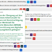 Ein besonderes Highlight der Aktion ist der Schulterblick in das DisAM-Hybridlabor: Fünf Laborantinnen und Laboranten stellen ihre Arbeitsergebnisse nach einem Jahr Arbeit zum Thema ‚Digitale Kompetenzen’ vor und diskutieren mit den Teilnehmenden über die Bedeutung digitaler Teilhabe und die Hürden auf dem Weg in die inklusive Digitalität.
