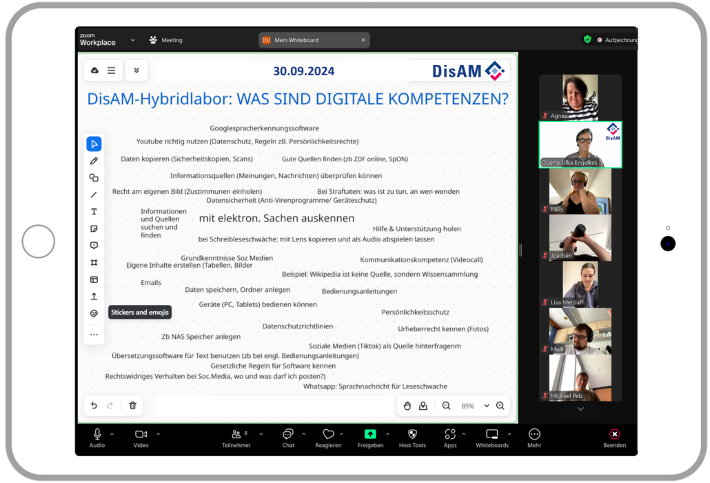 Für das DisAM-Modellprojekt an der Ostfalia Hochschule Wolfenbüttel hat Mediendesignerin Dörte U. Engelkes ein neuartiges Beteiligungsformat entwickelt, in dem Fachkräfte und WfbM-Beschäftigte sich fast zwei Jahre gemeinsam in Online-Workshops mit Digitalkompetenzen beschäftigen. Dabei werden interhierarchisch und durch kooperatives Lernen Digitalkompetenzen ausgebaut, eigene interaktive Lernmaterialien erstellt und die Entwicklung des virtuellen DisAM-Lernpanoramas partizipatorisch begleitet.